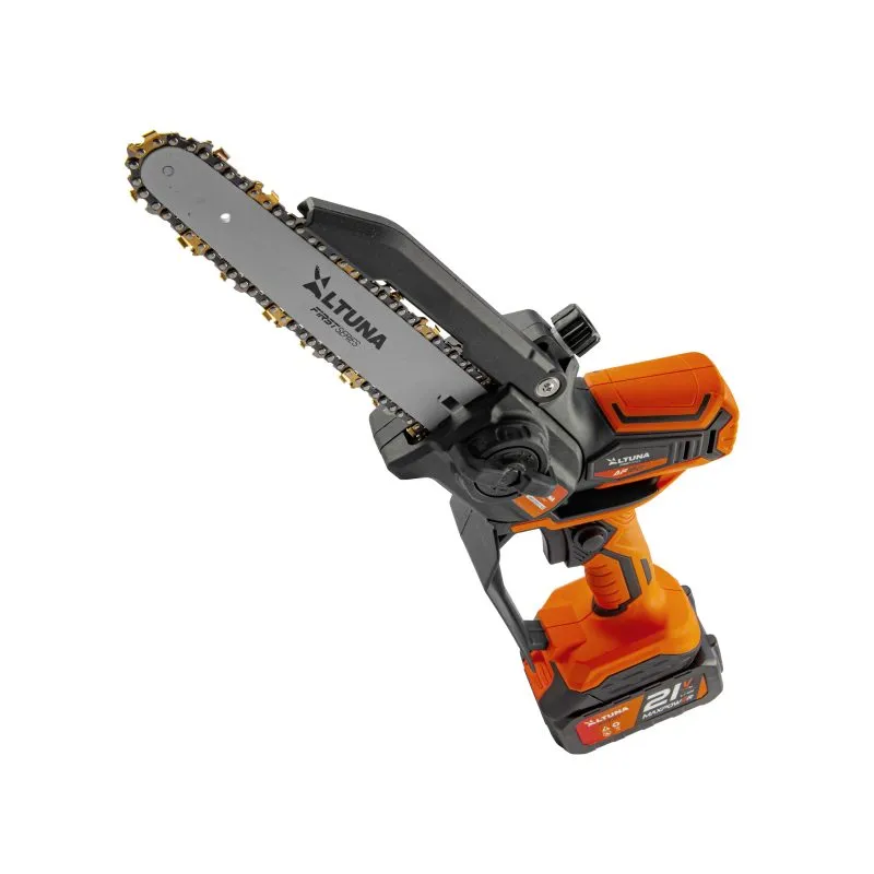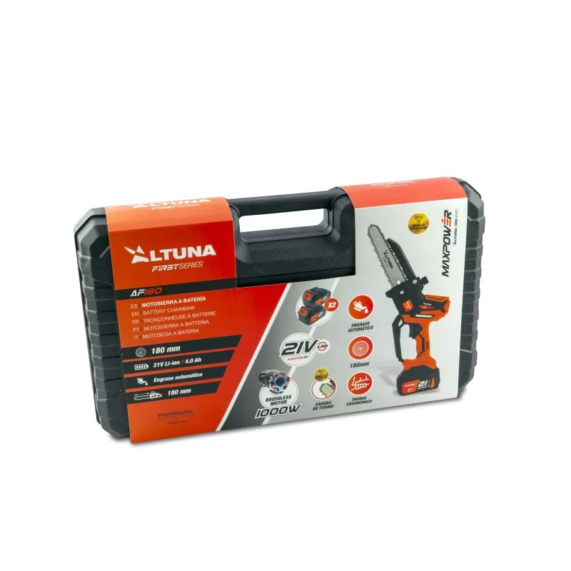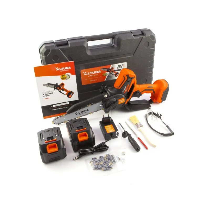 Motosega elettrica a batteria ALTUNA AF180 con motore brushless da 800 W, batteria da 21 V 4,0 Ah e catena in titanio. Capacità di taglio fino a 180 mm per potatura e giardinaggio ausiliari.